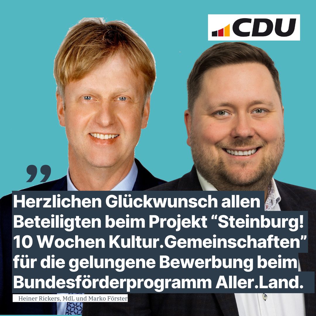 Kiel/Wilstermarsch, 20. Juni 2025 – Der CDU-Landtagsabgeordnete für den Kreis Steinburg und CDU-Kreisvorsitzende, Heiner Rickers, zeigt sich erfreut über die Förderzusage des Bundes für das regionale Kulturprojekt „Steihnburg! 10 Wochen Kultur.Gemeinschaften“ im Rahmen des Programms „Aller.Land“.