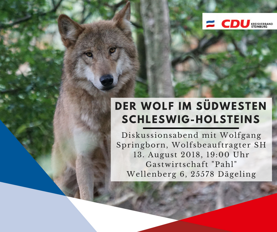 Seit einigen Jahren gibt es stetig Wolfsnachweise in Schleswig-Holstein, nun auch bei uns in Steinburg. Wir wollen diesbezüglich aufklären und so an einer sachlichen Debatte in dieser Thematik festhalten, weshalb wir Sie hiermit gern zu einer Diskussionsveranstaltung einladen. Wolfgang Springborn, Wolfsberater des Landes, wird uns einen Einblick in dieses vielseitige Thema und seine Arbeit geben. Anschließend ist Raum für Diskssuion mit ihm,