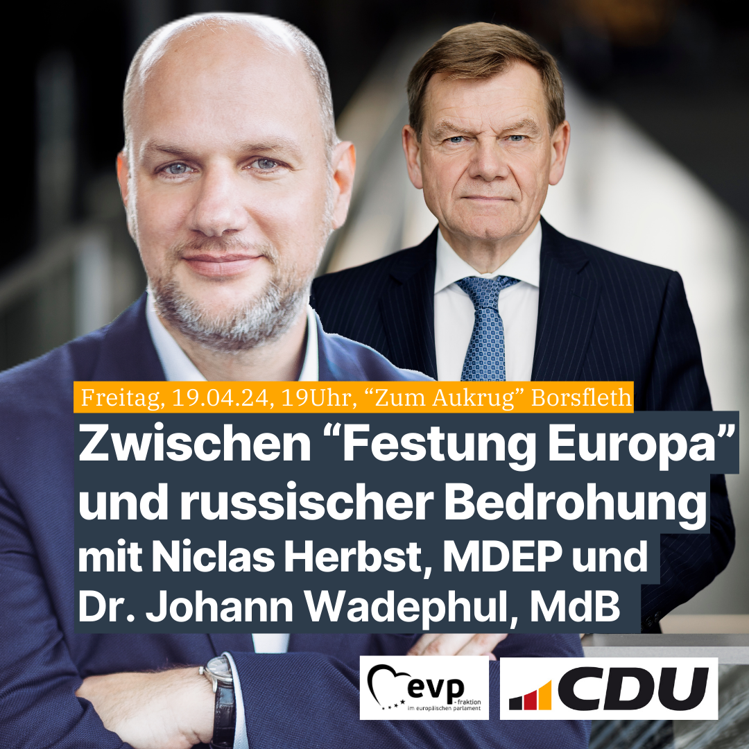 wir freuen uns, Sie zu einem ganz besonderen Termin einladen zu dürfen. Gemeinsam mit unserem Schleswig-Holsteinischen Spitzenkandidaten zur Europawahl, Niclas Herbst, MdEP, und dem Experten für Sicherheits- und Verteidigungspolitik, dem stellv. Vorsitzenden der CDU-Bundestagsfraktion, Dr. Johann Wadephul, MdB, diskutiert Lars Kasten zentrale Fragen der europäischen Sicherheits- und Migrationspolitik.
