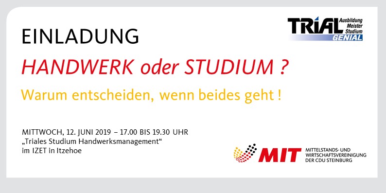 Die Fachhochschule des Mittelstands (FHM) und die Handwerkskammer (HWK) aus Hannover berichten von ihrer jahrelangen Erfahrung, dem Ablauf des Präsenzunterrichtes und E-Learning sowie der engen Bindung an den Ausbildungsbetrieb. Unser Ziel als MIT ist es, dieses Modell zusammen mit den hiesigen Handwerksbetrieben & Berufs- und Fachhochschulen auch in Schleswig-Holstein zu etablieren und unsere Landespolitik zur Umsetzung zu bewegen. Einsatzbereiten Schülern und Azubis bietet es neue Perspektiven neben den gängigen Ausbildungsarten. Ich würde mich freuen, Sie bei dieser Veranstaltung begrüßen zu dürfen.