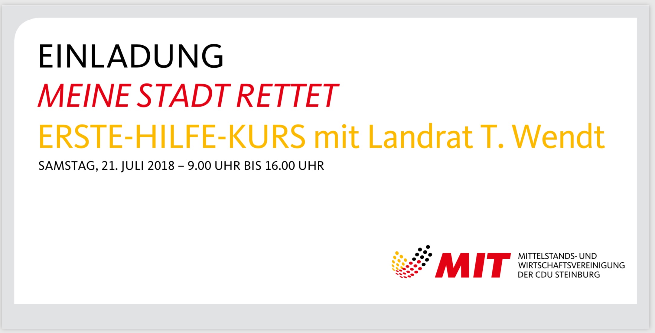 Die MIT im Kreis Steinburg möchte neben ihrer wirtschaftlichen Verantwortung auch auf diese spezielle gesellschaftliche Verantwortung hinweisen und bietet daher in Kooperation mit dem Deutschen Roten Kreuz einen umfangreichen eintägigen Erste-Hilfe-Kurs an. Wir freuen uns sehr, dass wir dafür als Schulungsleiter den Landrat des Kreises Steinburg, Herrn Torsten Wendt, gewinnen konnten. Selbstverständlich erfüllt diese Kurs alle gesetzlichen Ansprüche und kann somit auch als Nachweis für Ersthelfer in Betrieben dienen.